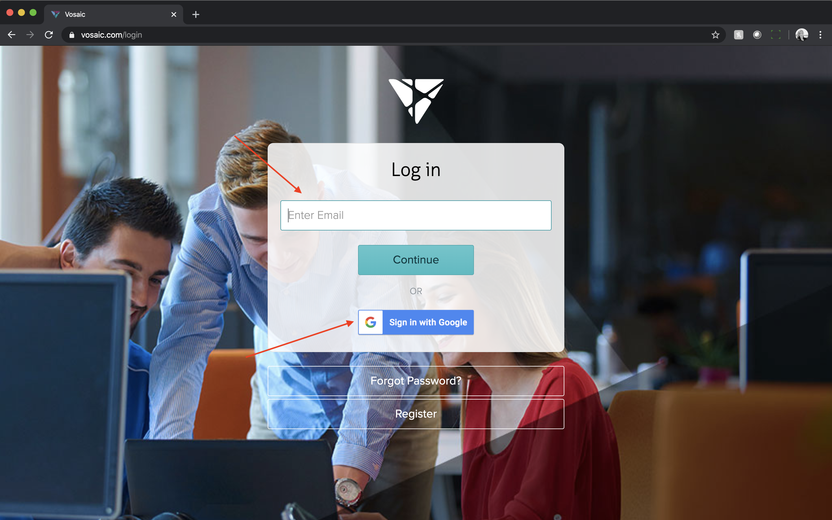 2. Either enter the email address associated with your Vosaic account or sign in with Google, then click Continue.